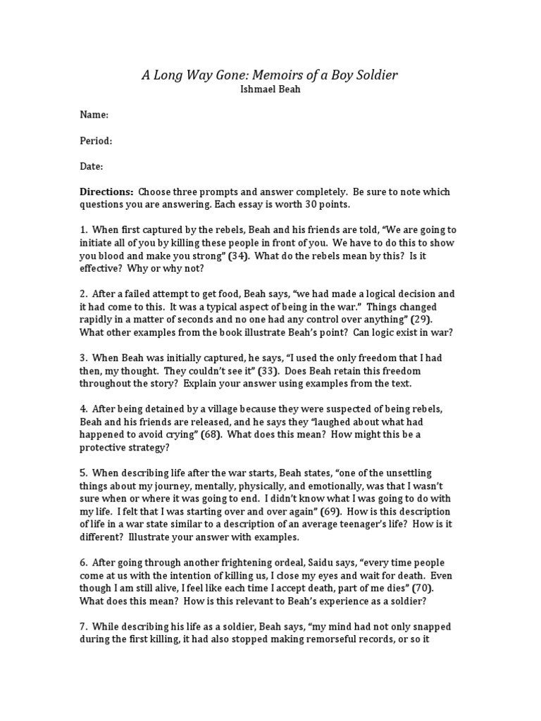 This set of Lesson Plans consists of approximately pages of tests, essay questions, lessons, and other teaching materials. Print Word PDF. View a FREE sample. More summaries and resources for teaching or studying A Long Way Gone: Memoirs of a Boy Soldier. A Long Way Gone: Memoirs of a Boy Soldier from BookRags. About BookRags Customer Service Terms of Service Privacy Policy Copyright by BookRags, Inc.